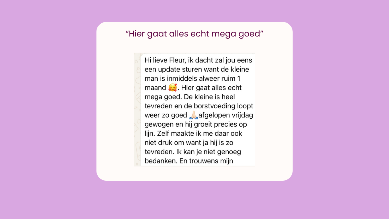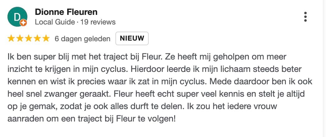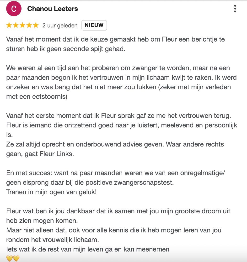 Tijdens mijn zwangerschap had ik al het een en ander gehoord over het terugkrijgen van je natuurlijke cyclus met leefstijlaanpassingen. Ik was hier zeer sceptisch over, maar na lang twijfelen heb ik uiteindelijk de stap genomen om een kennismakingscall in te plannen met Fleur. Direct voelde ik een klik met Fleur, ze stelt je op je gemak. Ondanks dat ik er nog niet voor 100% in geloofde dat ook ik weer een cyclus zou krijgen, ben ik het avontuur met Fleur aangegaan. We kunnen het altijd proberen toch?